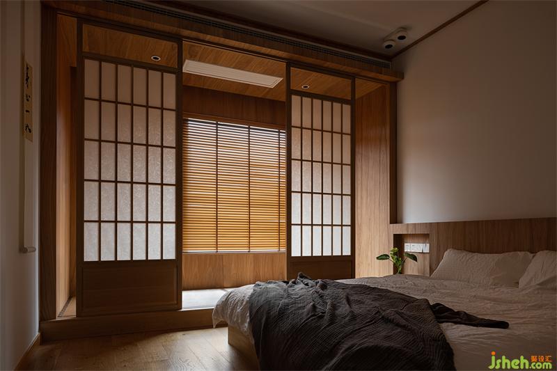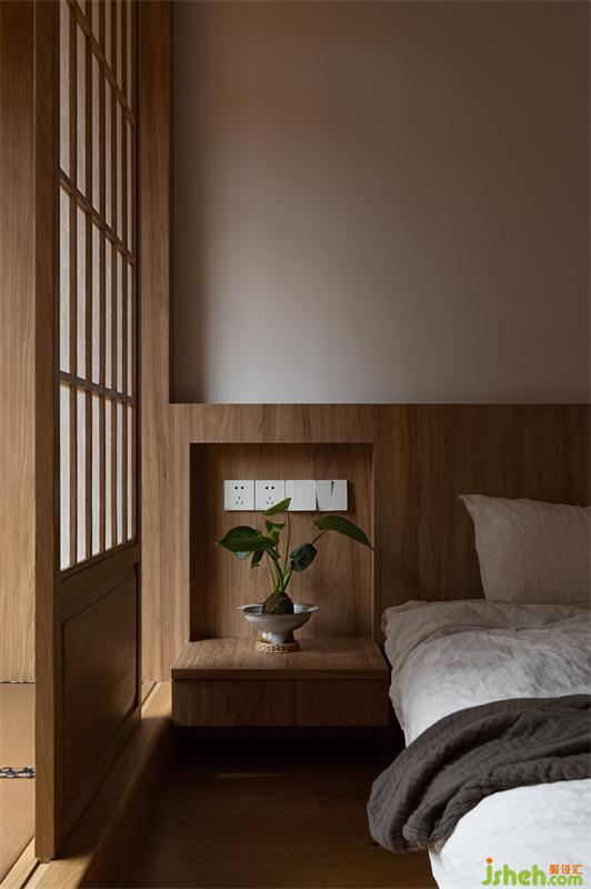 主臥的床也是實(shí)木定制,榆木的木質(zhì)感強(qiáng),木紋與顏色都恰到好處,不會(huì)過深也不會(huì)過淺。床沿的高度與榻榻米陽臺(tái)齊平,不會(huì)過于突兀。