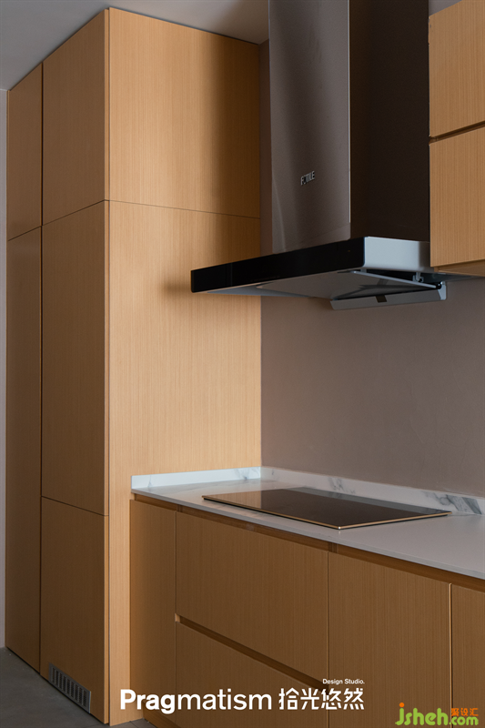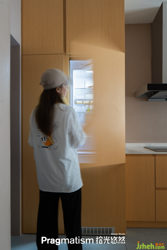 小戶型更需考慮整潔度和空間的利用率,因此在設(shè)計上,大部分家電采用嵌入式處理。冰箱隱藏在入戶左側(cè)柜體內(nèi)部,下方預(yù)留出通風(fēng)口,同色的木飾面體現(xiàn)出一體化的美感。