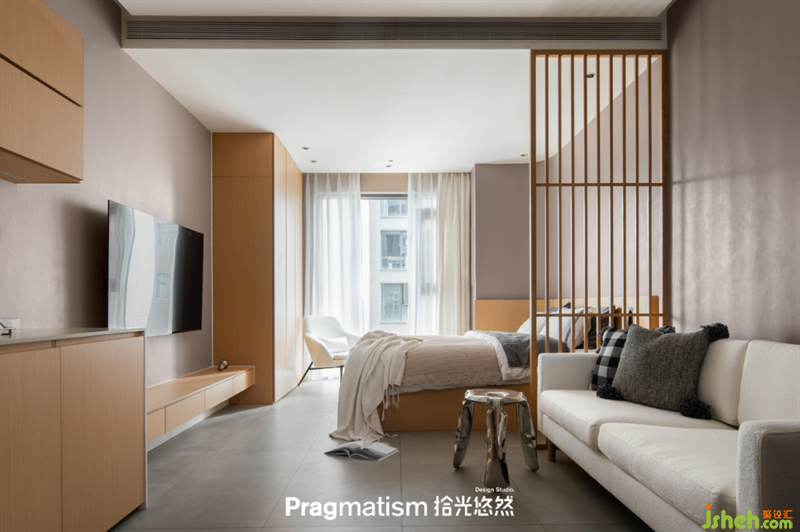 客廳區(qū)域面積較小,因此要盡量選擇小型家具。2~3人的象牙白沙發(fā)既可舒服躺臥,待客時也不顯局促。格柵作為客廳和臥室的隔斷,不妨礙整個空間的采光,保證通透感,明暗相間的光影效果也成為房屋中一處別樣的景致。