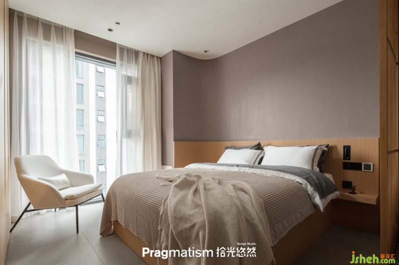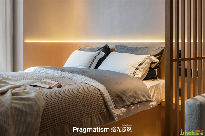 床頭背景做弧形造型,與入戶的弧形墻體相呼應(yīng);可彎折的硅膠燈帶嵌入其中,一同組成流暢線形,更好的發(fā)散性也烘托出一人居的溫暖。嵌入式的小臺燈和移動插座,使用更加便捷?,F(xiàn)場木作的落地床,不留衛(wèi)生死角。