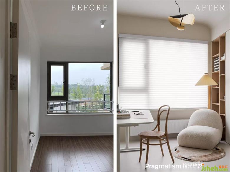 材質上以棉麻、藤編、木質、百葉為主,搭配少量的紙質、金屬。配色上則以奶茶裸色為基調,家裝設計加入原木色系的木質、柔軟的紗麻,加上少量的黑灰色點綴,整個空間舒適而治愈。
