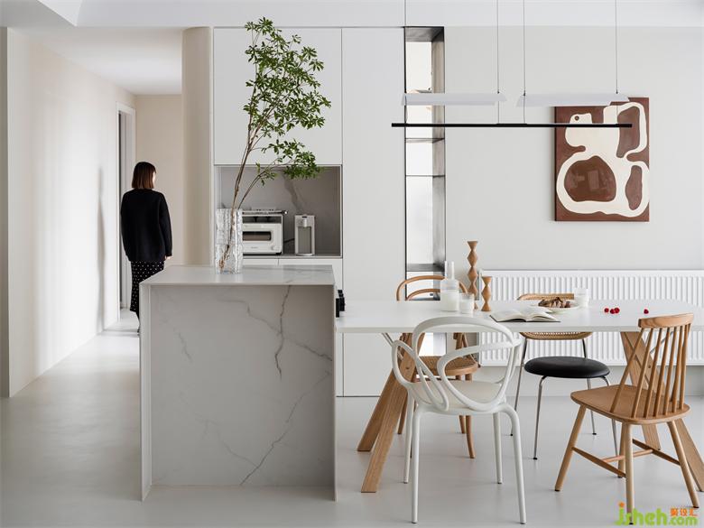 餐廳區(qū)域?yàn)閸u臺(tái)+餐桌的形式。我們將餐桌后面的非承重墻拆除,多出的空間設(shè)計(jì)為背對(duì)的餐邊柜+雜志架,并在邊緣做弧形處理,與頂部相呼應(yīng)。