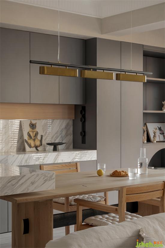異形島臺為現(xiàn)場制作,側(cè)面留有軌道插座,成都家裝設(shè)計(jì)底部留有儲物柜。島臺高度略高于餐桌,餐桌抽出后可增加3個就餐位,親朋聚餐一點(diǎn)也不局促。
