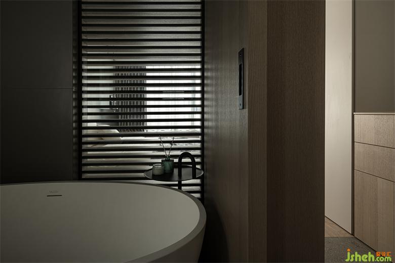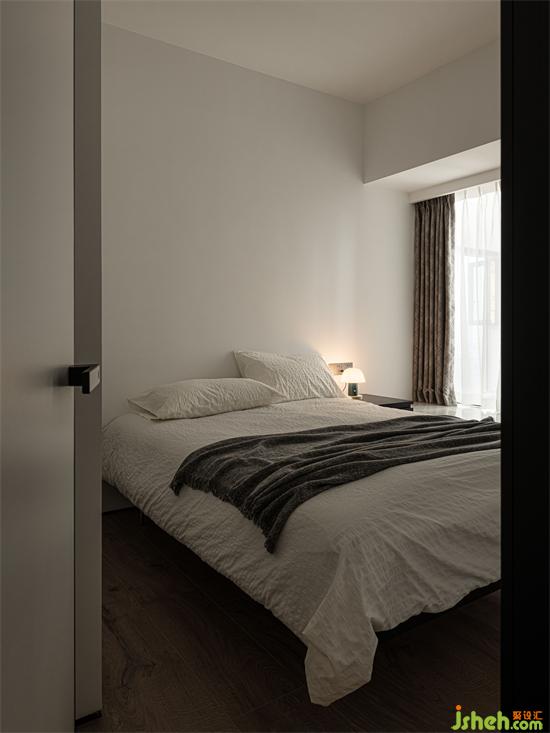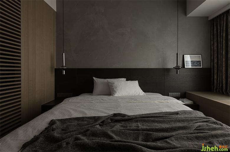 主臥延續(xù)了公區(qū)的沉靜氛圍,黑白灰與木質(zhì)元素相融合,眼睛和身體可自然放松,更宜入睡。