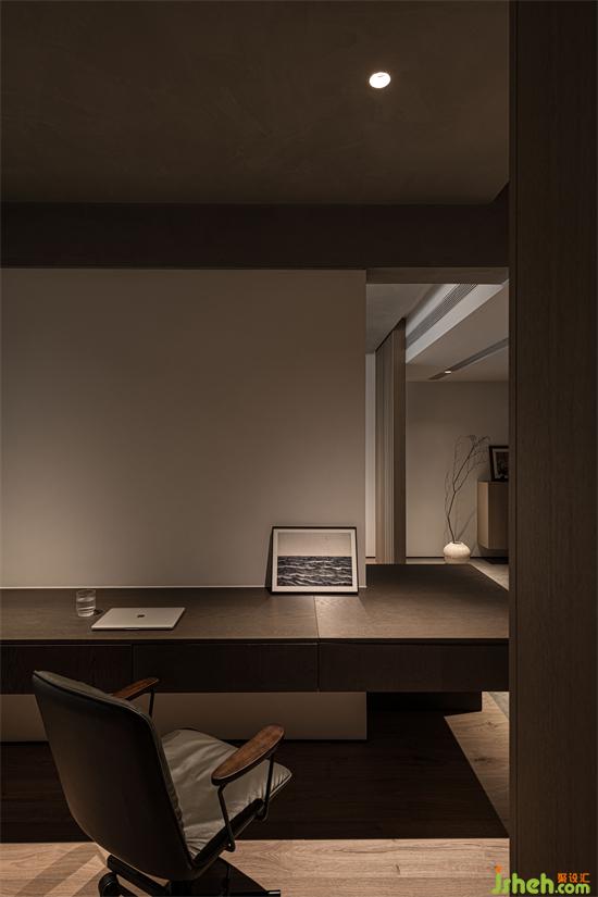 家裝設(shè)計根據(jù)屋主的儲物需求,在書房圍合出一間儲藏間,便于收納暫存物品。移門一合,生活里的瑣碎之物全部隱藏身后。
