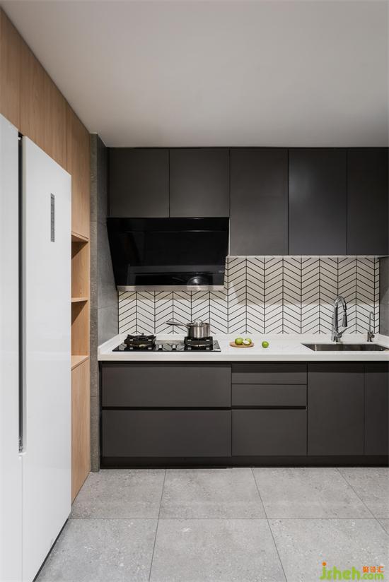 因為墻面結(jié)構(gòu)原因,家裝設(shè)計將廚房打造為半開放式,并且將西廚功能移至餐廳,擴(kuò)大廚房的使用需求和收納需求。