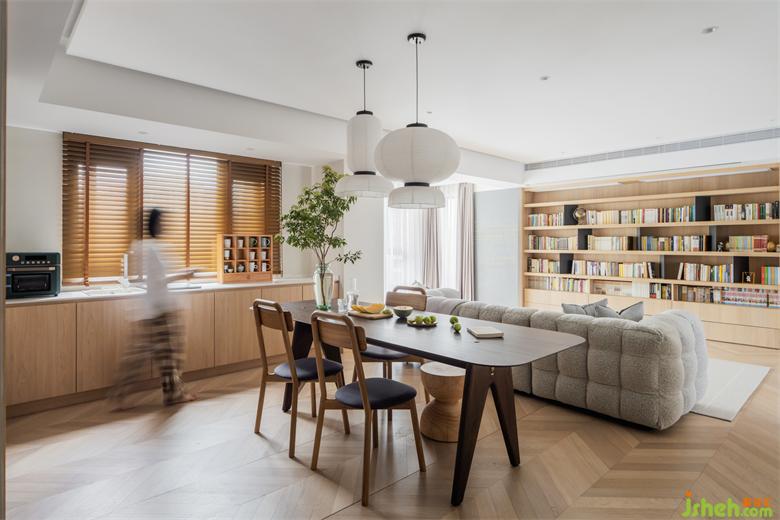家裝設(shè)計將客廳與陽臺劃為整體區(qū)域,制作大面積的書柜,確保屋主的藏書需求。陽光透過窗紗,柔和細(xì)膩,為閱讀提供舒適的光線。將書房空間外擴(kuò),打造收納兼具親子互動的可變空間。