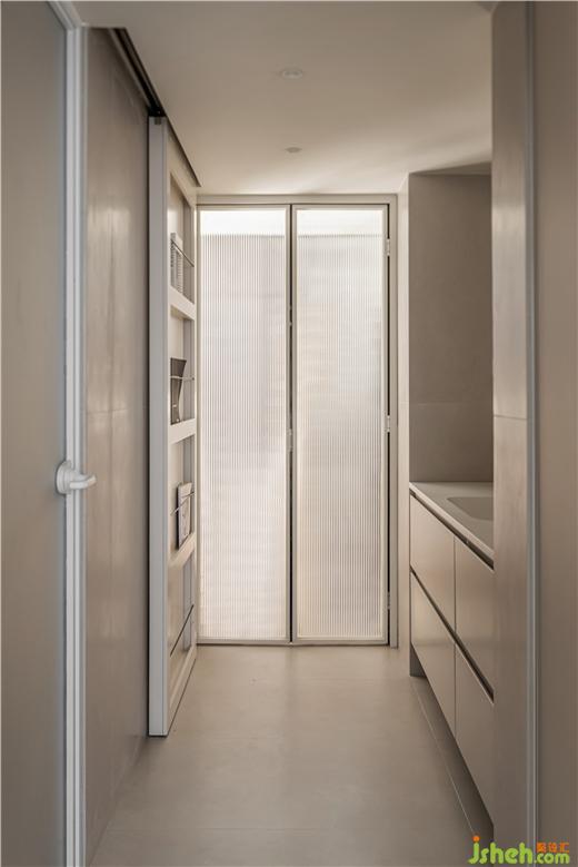 于是設計師將陽臺的部分墻體拆除,打開入戶的視線,獲取美觀的入戶體驗。同時,將主動線上移,擴大走廊尺寸,使全屋動線具有更好的舒適性。