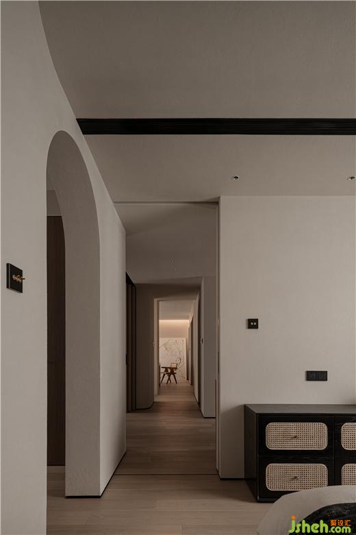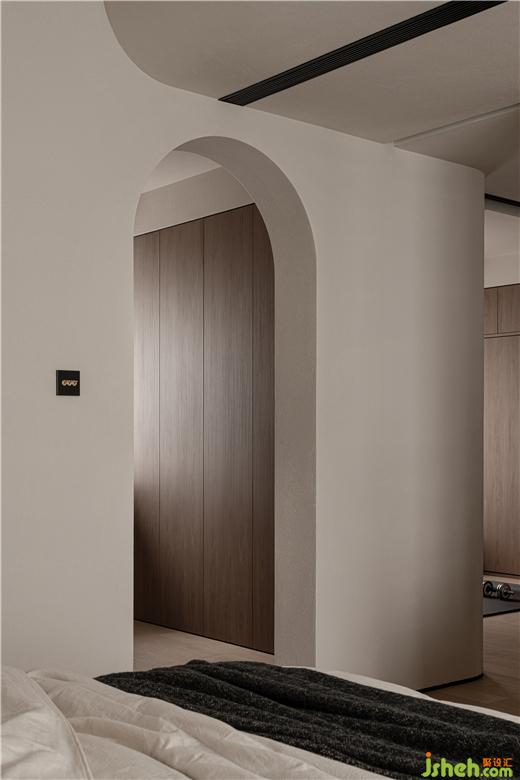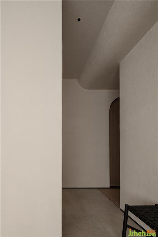 陽臺納入客廳空間,利用弧線造型包裹原本陽臺的梁與柱,柔和的過渡使得空間線條感更為流暢,視覺層次感更為豐富。沙發(fā)臨窗而置,即為了更好的視野,也是為了營造出更為愜意的空間意境,在日常生活中難以得到的狀態(tài)。