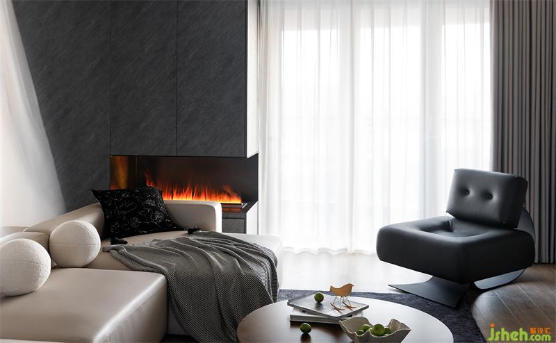 拆除書房墻體后,根據(jù)其位置靠墻打造了一個頂天立地的儲物柜,提供充足的儲物空間,柜門與同色系的背景墻融為一體,整體性更強,空間更顯整潔利落。儲物柜與沙發(fā)扶手等高處留空,嵌入電子壁爐,為家?guī)頊剀芭狻?