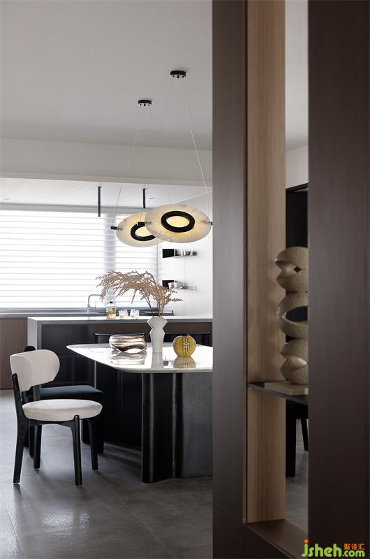 書房選用深色木質(zhì)書桌與書柜,打造出沉靜的空間感。簡約大氣的落地藝術(shù)擺件,結(jié)合大理石和木材的自然紋理走向,讓空間兼顧美觀性的同時,植入安靜純粹的精神觀感。