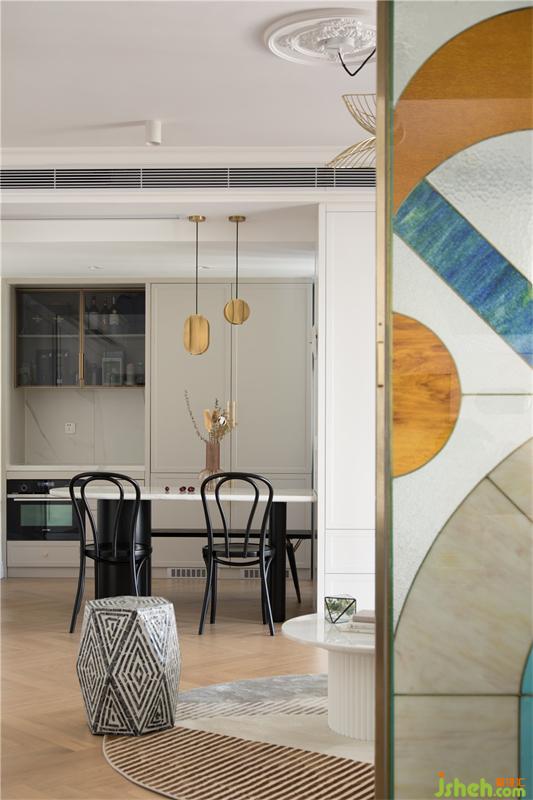 透過(guò)屏風(fēng)看餐廳,西廚臺(tái)面旁邊是兩扇隱藏式冰箱門,這樣讓空間更加整體風(fēng)格更加統(tǒng)一和諧。