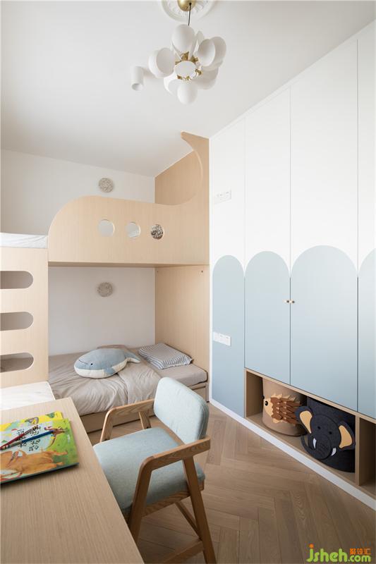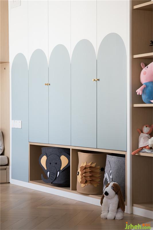 衣柜上半圓形的色塊,淺淺的藍(lán)色是小朋友柔柔的美夢(mèng),也呼應(yīng)著海浪的主題,下面特意空出來(lái)的玩具整理盒,更有利于小朋友養(yǎng)成自己收拾玩具的良好習(xí)慣。
