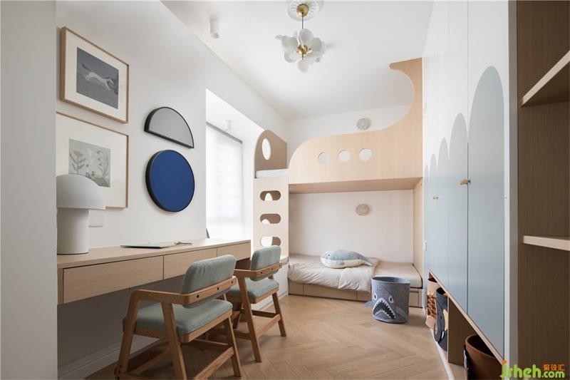 特意將凸窗的高度拉平和寫字臺(tái)一樣寬,鋪上軟墊,這樣小朋友多了一個(gè)能半躺著看書的地方,法式裝修設(shè)計(jì)雙層床的樓梯剛好設(shè)計(jì)在這個(gè)臺(tái)面以上,也減少了樓梯的踏步。通過(guò)兩個(gè)圓形的透光孔,小朋友也能來(lái)回的鉆洞玩耍,十分歡樂(lè),這是用于這種雙層床靠近凸窗的比較特別有趣的處理范例。 而上下床的設(shè)計(jì)也增加了小朋友之間的互動(dòng)空間,讓他們的童年更有趣和難忘。