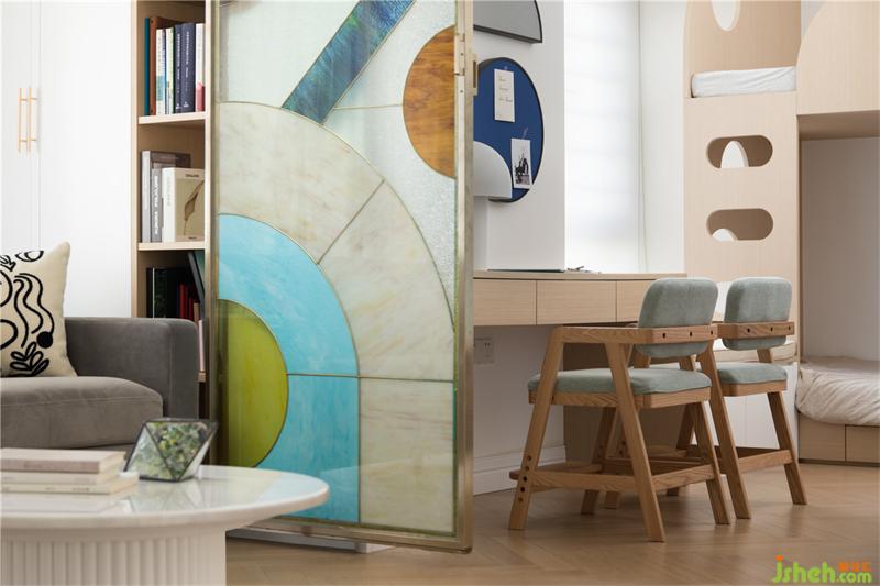 軟木板和掛畫相互組合成墻面的藝術(shù)品,這樣軟木壁掛上既能插照片又能插小朋友自己的畫,十分有趣,側(cè)面還有一個客廳借來的書架,方便書桌平時學(xué)習(xí)的書本安放。