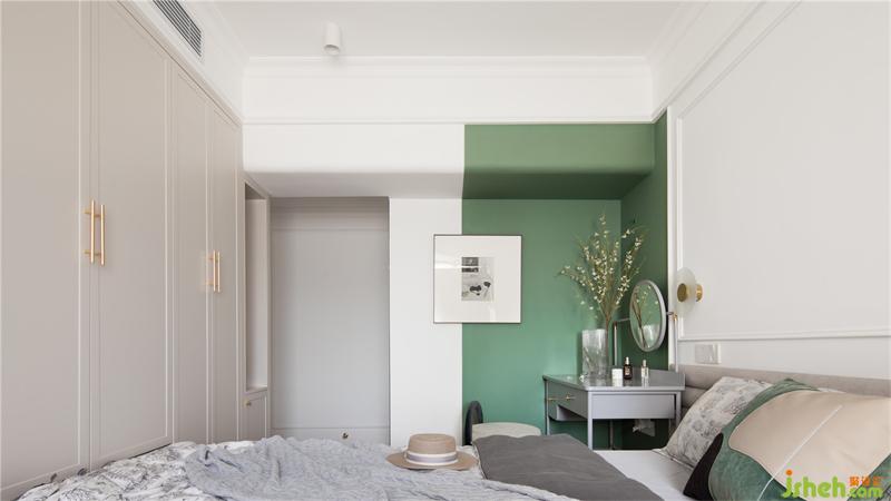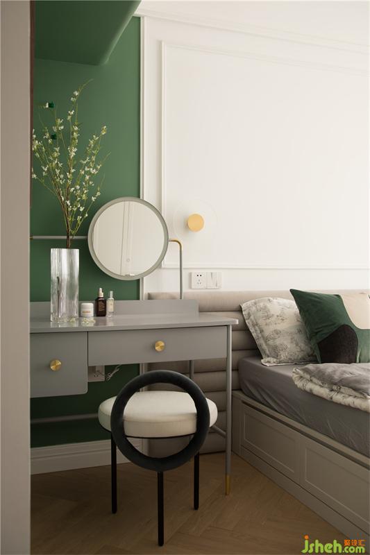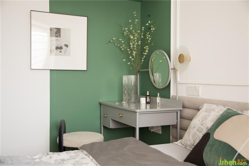 主臥通過簡單的綠色局部粉刷以及線條框和軟包的組合,讓原本局促的主臥,也顯得特別的有格調(diào)。