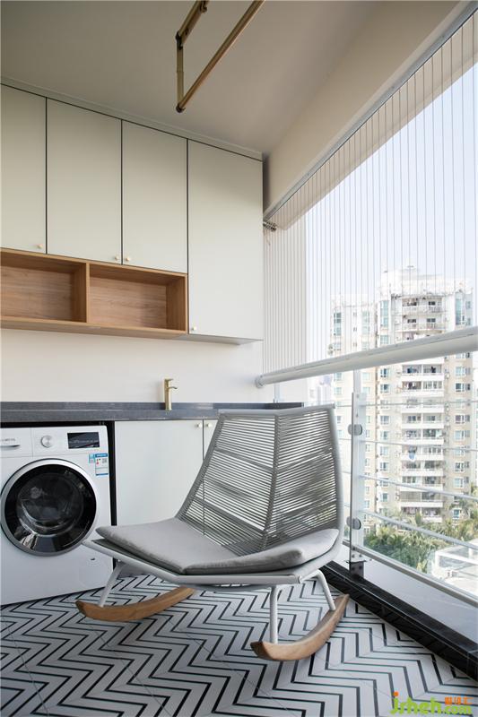 陽臺設(shè)計了洗衣區(qū),動感的線條地磚,舒適的搖椅,被陽光輕吻過帶著花香的衣服,一點(diǎn)一滴匯聚成了溫暖的家。