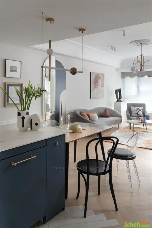 考慮到更好的打理,廚房和入戶都選用了瓷磚。法式家居設(shè)計(jì)通過瓷磚和人字地板的相互交錯(cuò),讓整個(gè)空間的過渡變得更自然。印象派的法式城堡和藍(lán)色邊框的畢加索的抽象畫和這藍(lán)色的島臺(tái)相得益彰。