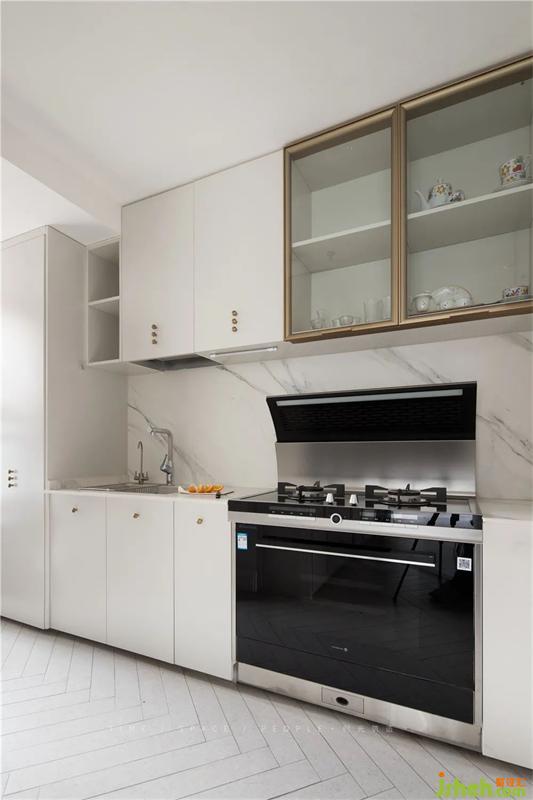 櫥柜拉手的陣列式排布,讓拉手也成為柜門的裝飾,隱藏式濾水籃的設(shè)計(jì),讓功能兼顧美感。淺灰色水磨石的人字鋪搭配白色大花紋巖板,讓廚房大氣又充滿細(xì)節(jié)。
