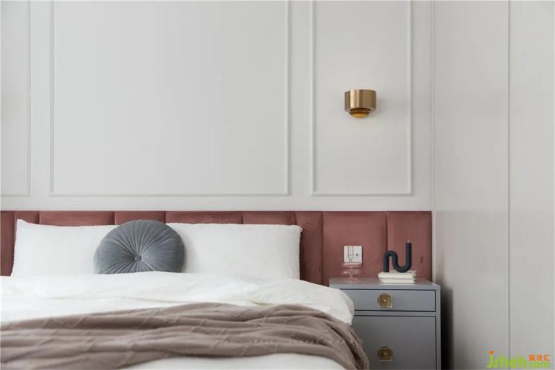 主臥用了一個偏暖棕色的臟粉色軟包做滿床頭,搭配不同的奶灰色,淺灰色,局部點綴金色,空間溫暖而精致。