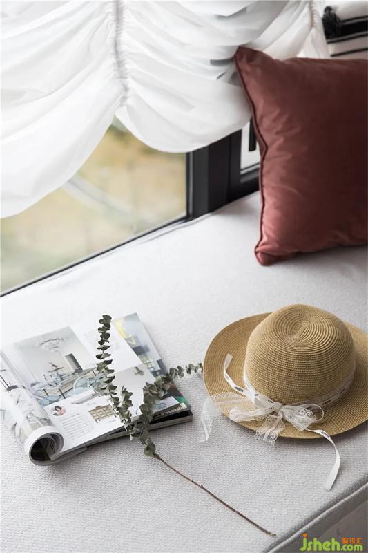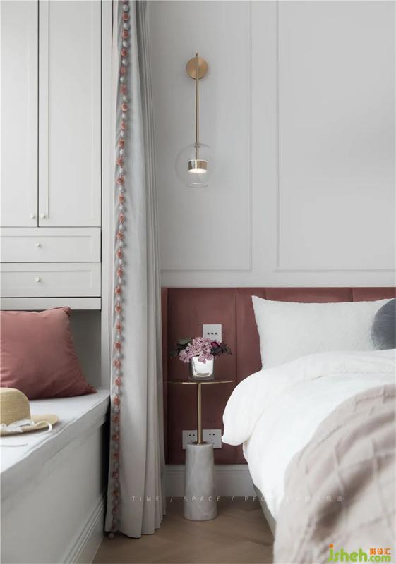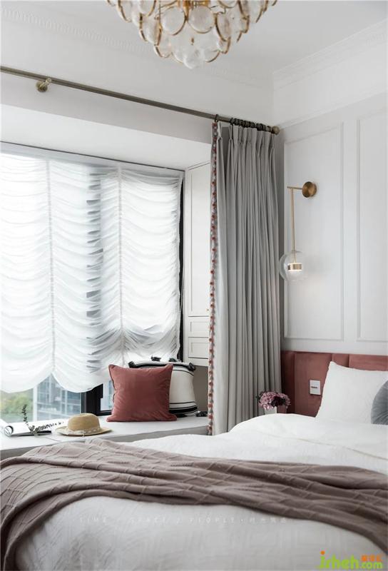 特意用了一個和法國典型的向上拉的紗簾,清晨的陽光透過紗簾透進來,法式家居設(shè)計軟軟的灑在雪白的床單上,我想你有100個理由再在床上賴床10分鐘,享受這片刻的溫暖。