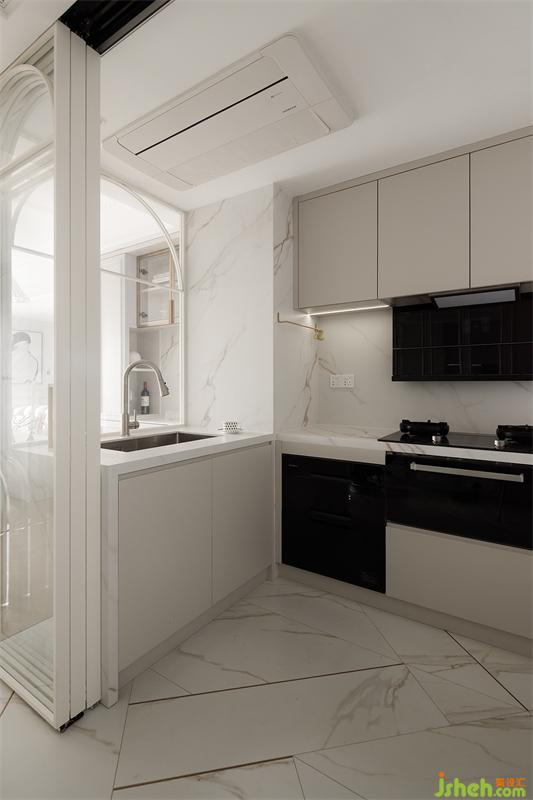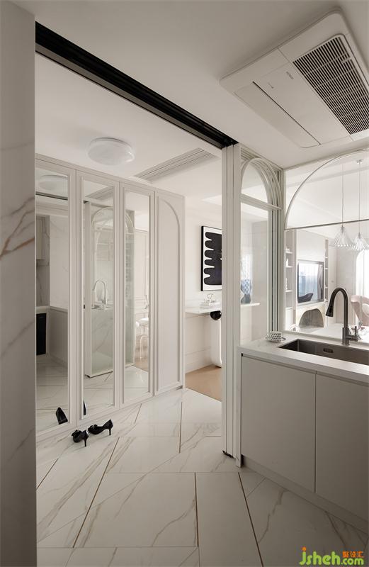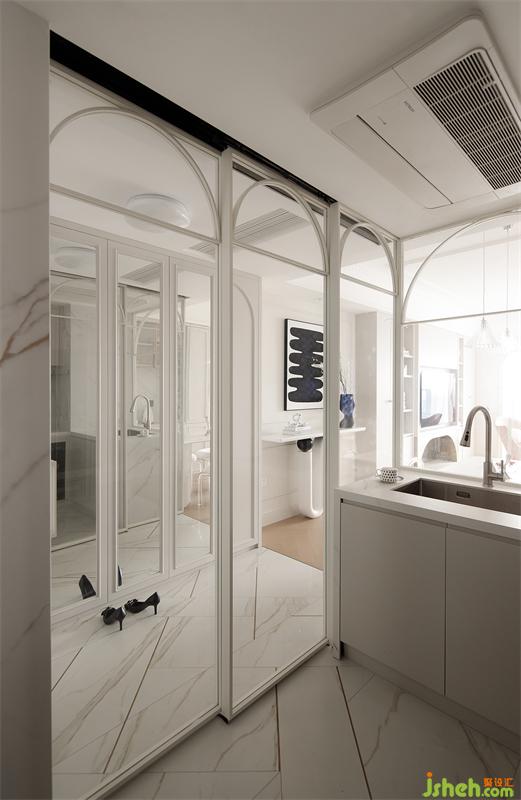 將廚房設(shè)計(jì)在進(jìn)門的右手邊,做了半透明的玻璃隔斷和推拉門,法式藝術(shù)設(shè)計(jì)讓廚房在關(guān)合間隨意切換,廚房對(duì)面的鏡子設(shè)計(jì)也讓制作美食的時(shí)光變得更加有趣。