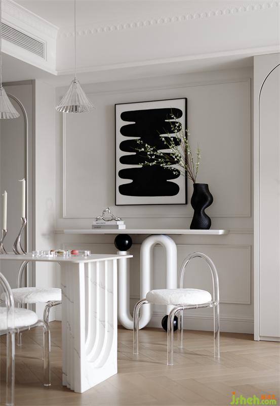 入戶的玄關(guān)臺(tái)特意與其他的部分做了凹凸的對(duì)比,即使是在靜止的空間內(nèi)我們也希望盡量呈現(xiàn)出動(dòng)態(tài)的視覺感受,法式藝術(shù)設(shè)計(jì)讓空間更立體也更有趣。一張藝術(shù)的玄關(guān)臺(tái),一幅抽象的黑白掛畫,一個(gè)憨態(tài)可掬的花瓶,簡(jiǎn)約的色彩點(diǎn)綴出入戶的特別之處。