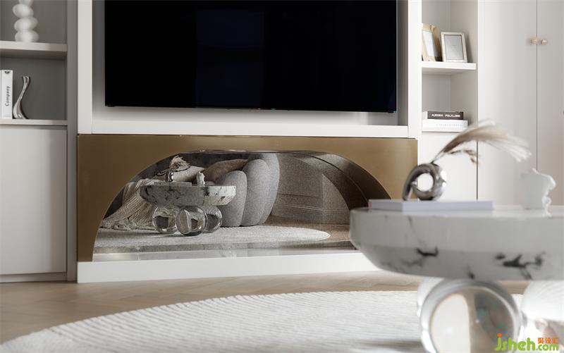 拱形收納柜門將法式的優(yōu)雅與浪漫凸顯出來,電視機(jī)的下方做了一些特別的法式藝術(shù)設(shè)計(jì),不銹鋼與復(fù)古鏡子的完美結(jié)合成為了電視機(jī)墻的視覺中心。溫潤(rùn)質(zhì)樸的實(shí)木,凌冽堅(jiān)硬的不銹鋼,干凈無瑕的玻璃鏡子幾種不同的材質(zhì)與顏色拼接碰撞出別具一格的效果,交融搭配并和諧共存。