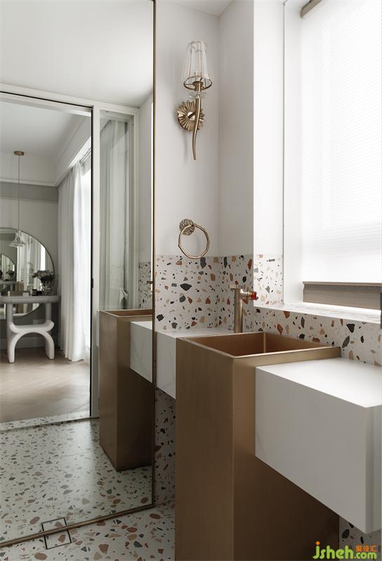 主衛(wèi)的設(shè)計(jì)在客廳的材質(zhì)選擇上進(jìn)行了延用,法式藝術(shù)設(shè)計(jì)不銹鋼洗手盆與法式的水晶壁燈一同呼應(yīng),彩色的水磨石瓷磚將空間變得生動(dòng)了起來(lái)。
