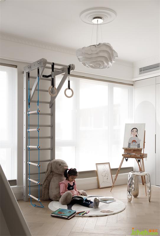 兒童房完美的隱藏在滑軌聯(lián)動(dòng)門的后面,國(guó)外原創(chuàng)冷門單品燈具,瞬間拉高了兒童空間的藝術(shù)調(diào)性。