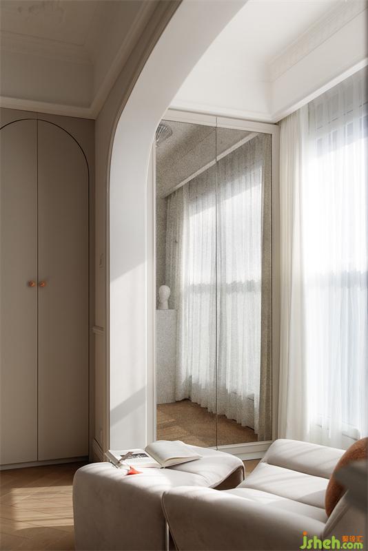 衣柜上的功能和入戶類似,特意安排在房門后面和床尾過(guò)道相對(duì),鏡子的大面積使用既能擴(kuò)展空間,又能有足夠的距離作為更衣鏡使用。