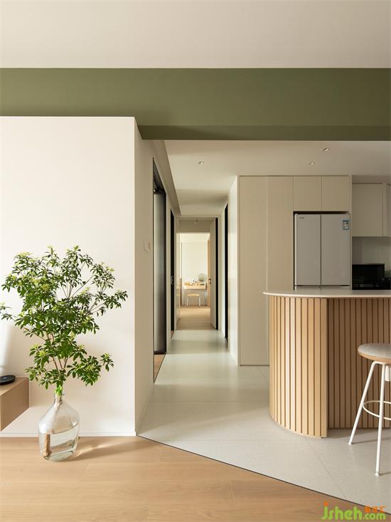地磚與地板連接處采用極窄收口條裝點(diǎn),家裝設(shè)計(jì)走廊連接“靜區(qū)”,廚房打開(kāi)后,采光明亮清晰,狹長(zhǎng)通道不再逼仄。盡頭通往主臥,靜謐獨(dú)立,生出一種曲徑清幽之感。