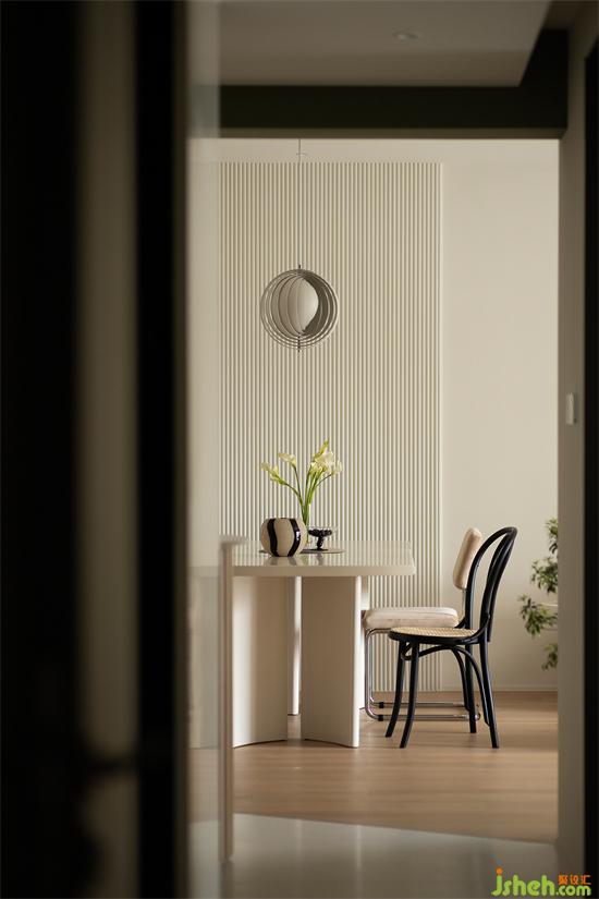 波浪板向上延伸,家裝設(shè)計(jì)吸引視線上移拉伸層高,輔以吊燈點(diǎn)綴,餐區(qū)作為走廊端景,美得像一副藝術(shù)畫(huà)作。