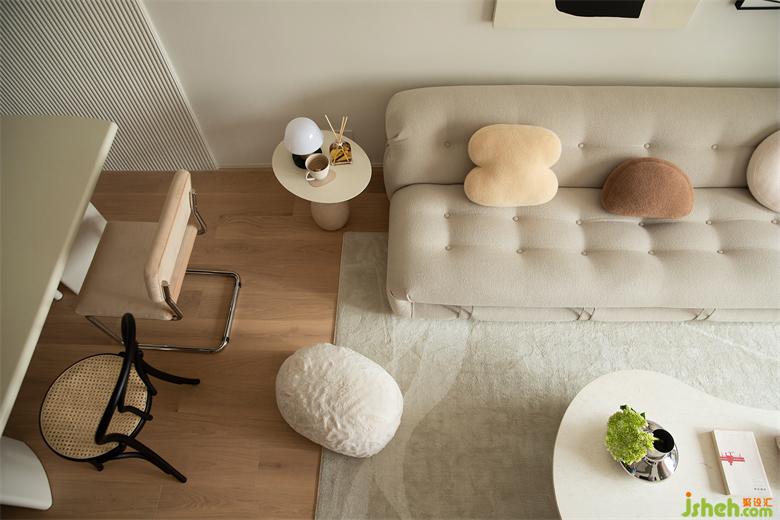 沙發(fā)、抱枕、地毯均為絨布質(zhì)感,親膚柔軟,符合整屋調(diào)性,家裝設(shè)計(jì)把家的溫馨舒適感展現(xiàn)淋漓盡致,這是奶油風(fēng)的基調(diào),也是家的真諦。