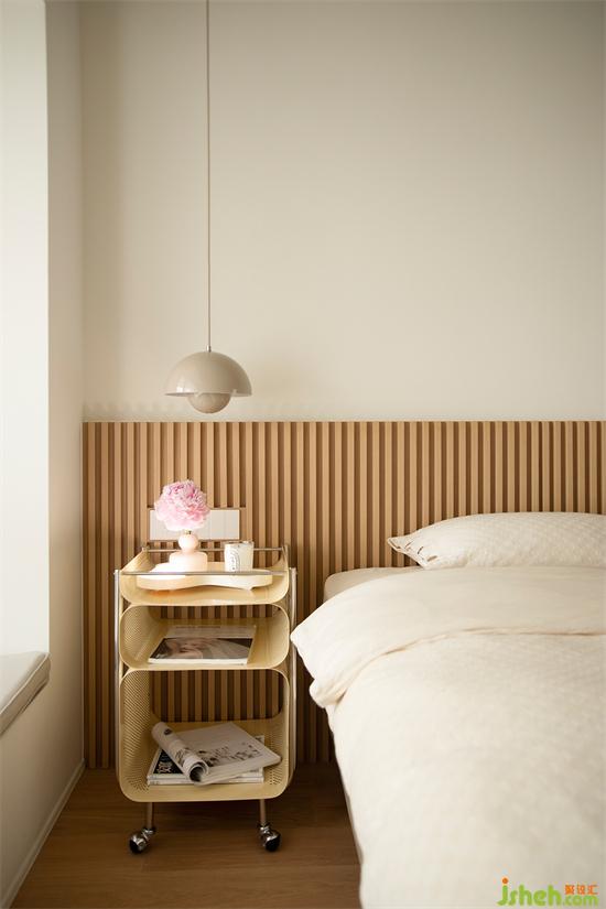 金屬質(zhì)感小推車代替笨重床頭柜。三層結(jié)構(gòu)有大有小,家裝設(shè)計(jì)滿足不同的收納需求,奶杏色花苞吊燈利落而下,點(diǎn)綴床頭溫馨氛圍。