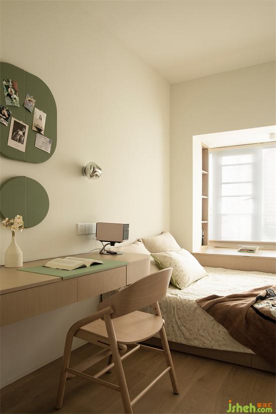 次臥連接陽(yáng)臺(tái),目前作為客房以及獨(dú)立書房使用,牛油果綠從公區(qū)蔓延至此,注入活潑氣息。