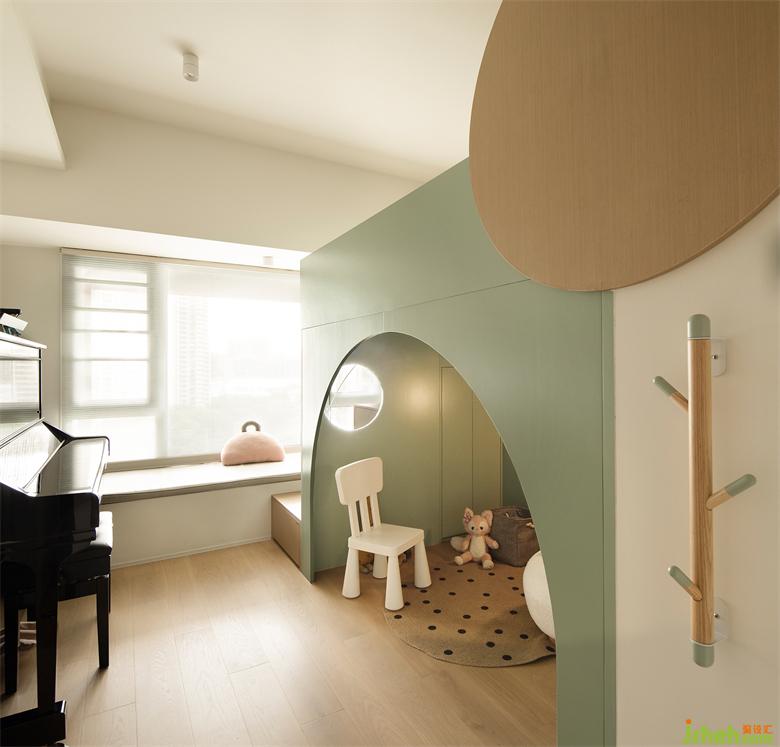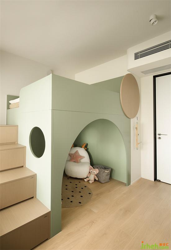 定制兒童床做成奶油綠調,呼應全屋色彩,清新活潑,符合兒童居住需求。上面是睡眠區(qū),下方拱形內(nèi)則是獨立玩耍區(qū),給孩子城堡般娛樂體驗。