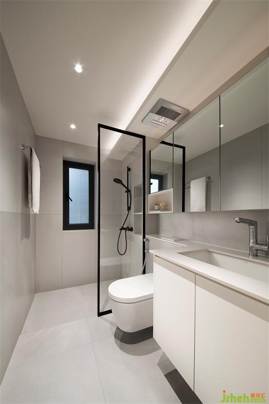 內(nèi)衛(wèi)采用灰白瓷磚通鋪,整潔統(tǒng)一,淋浴房采用下沉式設計,半框玻璃隔斷,視覺清爽無比。鏡柜一直延伸至馬桶區(qū)域,家裝設計拉伸空間的同時,加強收納能力。