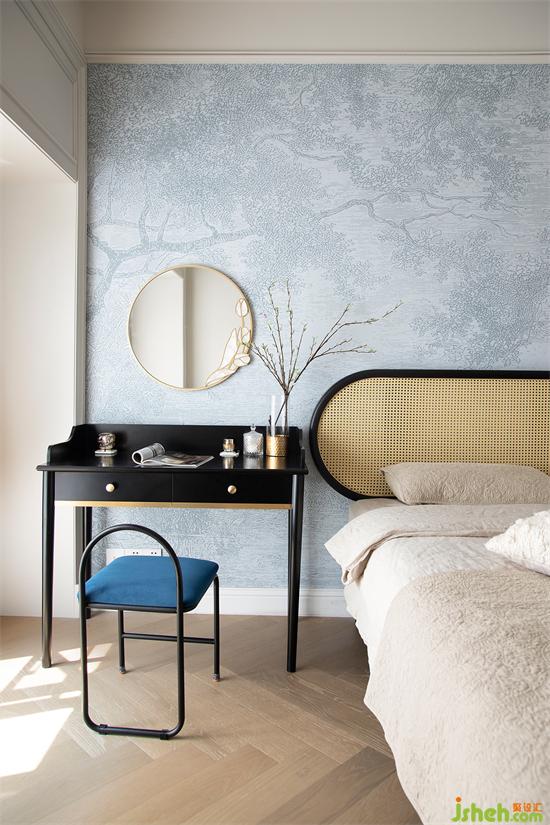 床頭一側(cè)擺放小巧梳妝臺(tái),梳妝椅坐墊用藍(lán)色點(diǎn)綴,呼應(yīng)墻面色彩。法式度假風(fēng)設(shè)計(jì)墻面掛置圓形梳妝鏡,日常梳妝也變得精致優(yōu)雅。