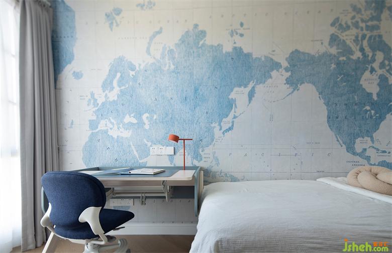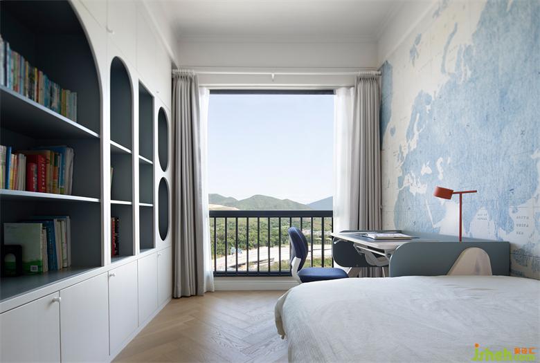 除了窗景誘人,兒童房其他設(shè)計(jì)依舊出彩,靠墻打造滿(mǎn)墻收納柜,中部采用各種形狀打造開(kāi)放格,法式度假風(fēng)設(shè)計(jì)形成童趣滿(mǎn)滿(mǎn)的書(shū)柜空間,收納空間豐富。另一面墻則用地圖狀壁紙鋪貼,床尾擺放兒專(zhuān)用書(shū)桌,暢游書(shū)海的同時(shí),亦能領(lǐng)略萬(wàn)好河山。
