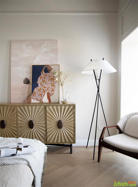 床尾擺放金色邊柜,一大一小兩幅裝飾畫(huà)錯(cuò)落而至,層次豐富更具藝術(shù)感,法式度假風(fēng)設(shè)計(jì)浪漫的法式度假氣息飄散在臥室每個(gè)角落。