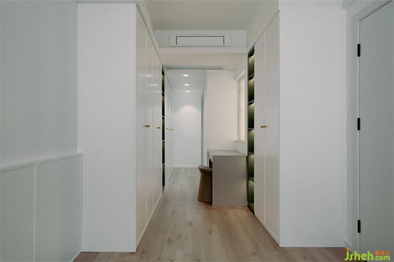 將主臥通往衛(wèi)生間的雞肋過道利用起來,墻面隱藏兩排通天衣柜,打造步入式衣帽間。家裝設(shè)計(jì)衣柜局部設(shè)計(jì)成開放格,可作展示也可作收納,實(shí)用性與顏值兩不誤。