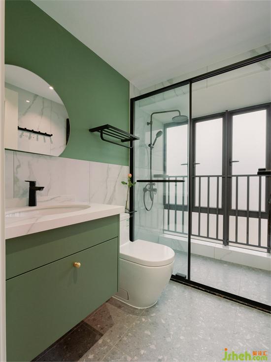 客衛(wèi)將淋浴區(qū)放在衛(wèi)生間內(nèi)側(cè)隔離,來劃分為干濕兩區(qū)。家裝設(shè)計干區(qū)墻面與浴室柜依舊是時尚清新的綠色,與整體空間相呼應(yīng),配上灰色系水磨石地磚,更顯低調(diào)高級。