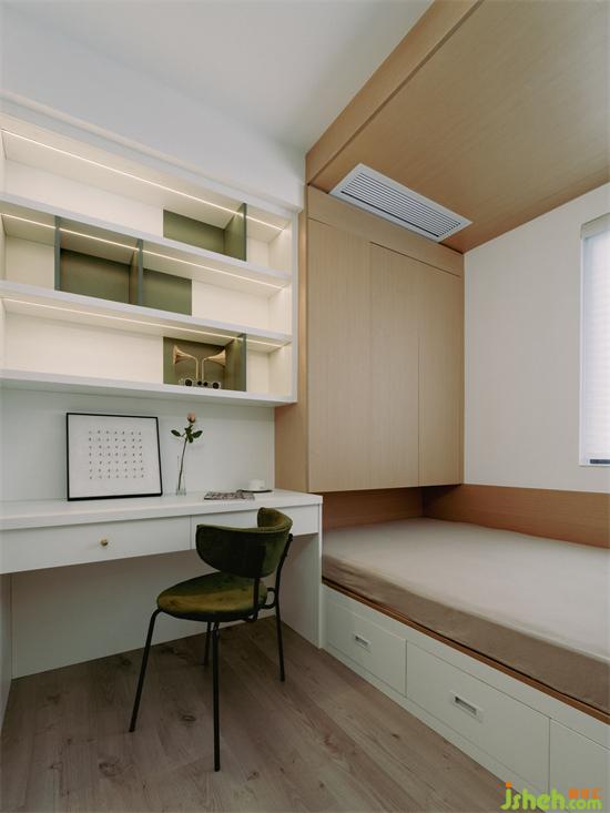 北面的小次臥設(shè)計成榻榻米床+組合衣柜+書桌的布局,滿足休息、學(xué)習(xí)、收納等需求,不管是作為備用的書房還是孩子的兒童房都很合適。