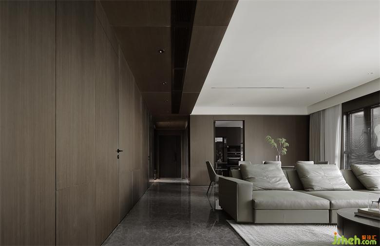 臥室分布在公區(qū)周圍,家裝設(shè)計為加強空間整體性,木飾面上墻將入口全部做成隱形門,很好的解決了這個問題,且提升了空間質(zhì)感。