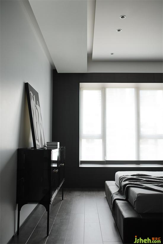 呼應(yīng)整體風(fēng)格,地板也選用灰黑色,與木飾面保持統(tǒng)一。家裝設(shè)計(jì)床尾放置斗柜,柜門是黑色鏡面質(zhì)感,不同材質(zhì)豐富空間層次,黑白色調(diào)裝飾畫矗立在上,彰顯時(shí)尚氣息。