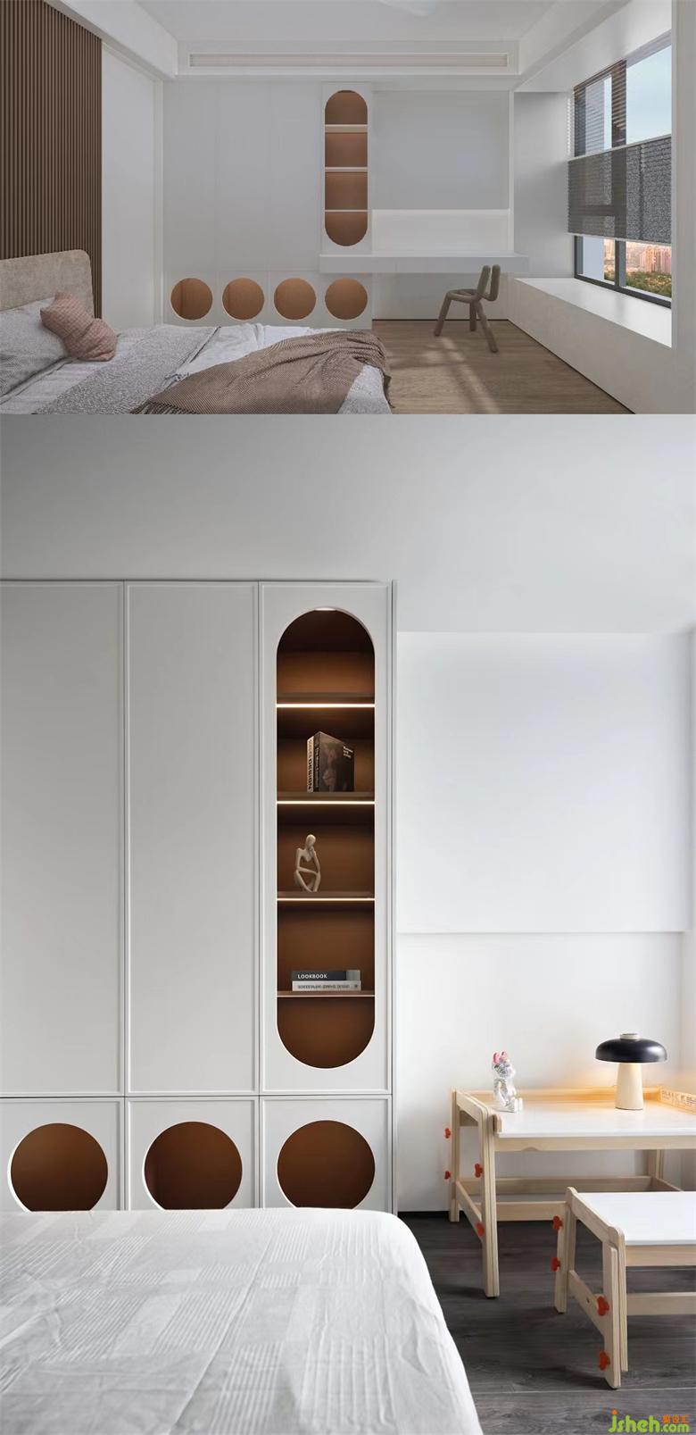 兒童房從全屋風(fēng)格里抽離,奶油白為主色調(diào),更加符合兒童喜好。床周用軟墊包裹,家裝設(shè)計(jì)防止磕碰且睡眠更有安全感。