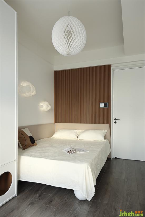床頭背景墻選用木飾面與巖板組合裝飾,家裝設(shè)計(jì)層次與質(zhì)感都更加豐富,床頭燈的高度也是符合人體工學(xué)的設(shè)計(jì),離地面90公分左右,躺在床上玩手機(jī)或是看書,不會(huì)晃到眼睛。