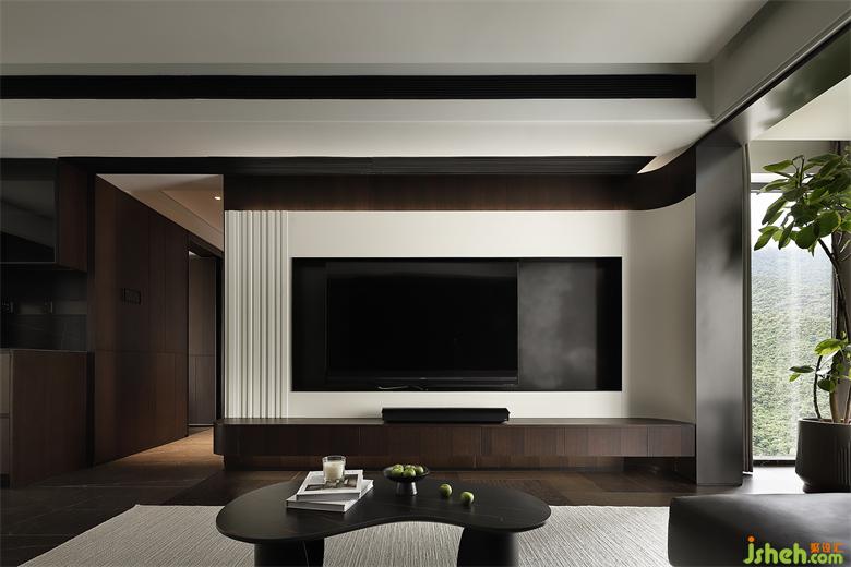 奶白調(diào)飾面板搭配質(zhì)感胡桃木,順承陽臺結(jié)構(gòu),采用弧面連接手法,整個電視背景墻更加流暢。家裝設(shè)計懸空抽屜柜賦予收納機能,隱藏網(wǎng)絡(luò)與繁瑣的接線設(shè)備,保持空間整潔清爽。