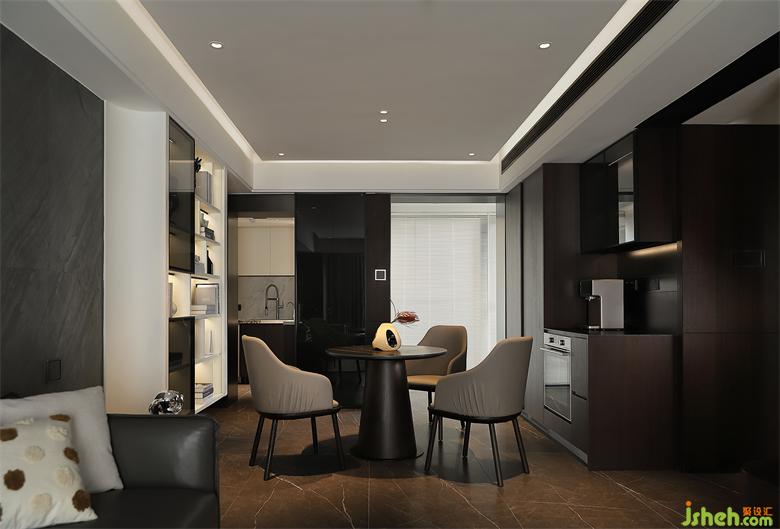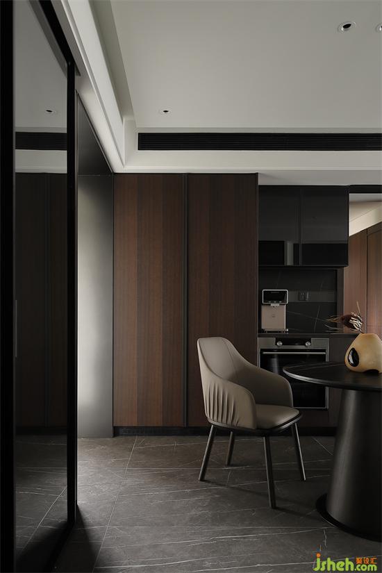 餐廳另一面墻是餐邊柜職能,高柜里隱藏的是嵌入式冰箱,整潔美觀,一旁搭配水吧臺,滿足各種儲物與生活需求。家裝設(shè)計南北通透,餐廳也有落地窗帶來的充足采光,深色材質(zhì)更好地發(fā)揮自身質(zhì)感,為空間鍍上品質(zhì)與格調(diào)。